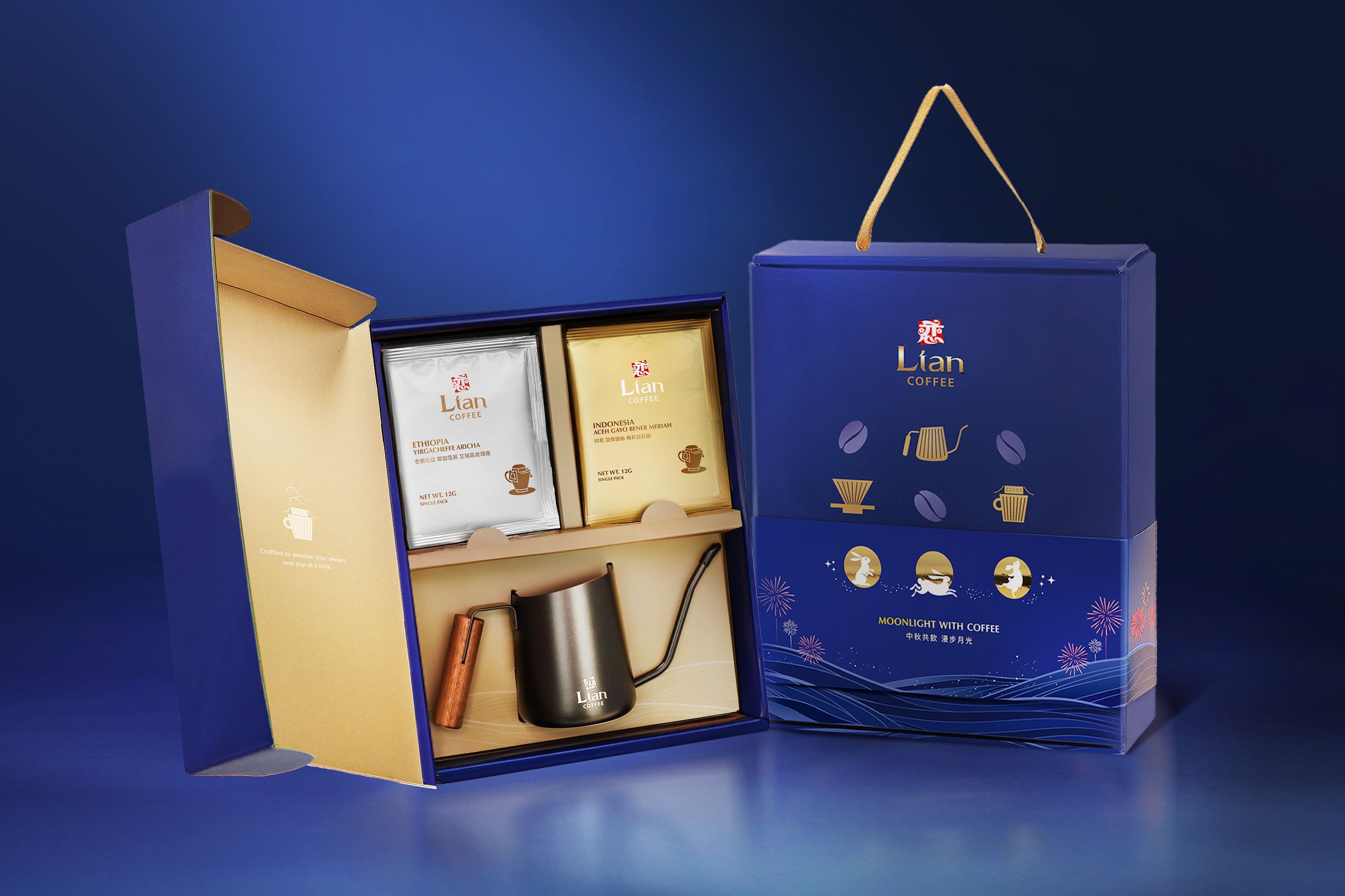 禮盒內含兩款精品濾掛咖啡各6入,並搭配專屬手沖壺。無論在家與親友共享,或在辦公室獨自靜心品味,都能輕鬆沖煮出專屬的節慶風味。這份禮盒不僅是味覺的饗宴,更透過沖煮過程營造一段「慢下來、好好相聚」的中秋時光。2025年中秋「戀」精品濾掛咖啡禮盒特別嚴選兩款精品咖啡: